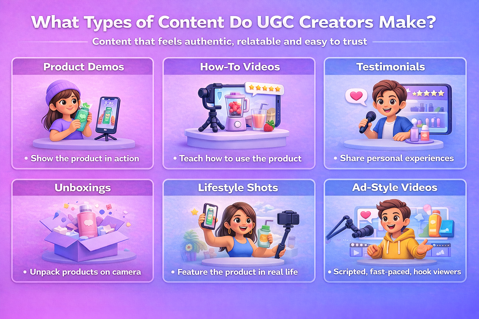 Common UGC formats include product demos, how-to videos, testimonials, unboxings, and lifestyle shots that show a product in real use. Many creators also produce scripted ad-style videos, voiceovers, and problem-solution clips tailored for platforms like Instagram Reels, TikTok, and YouTube Shorts. The goal isn’t virality — it’s clarity, credibility, and conversion.