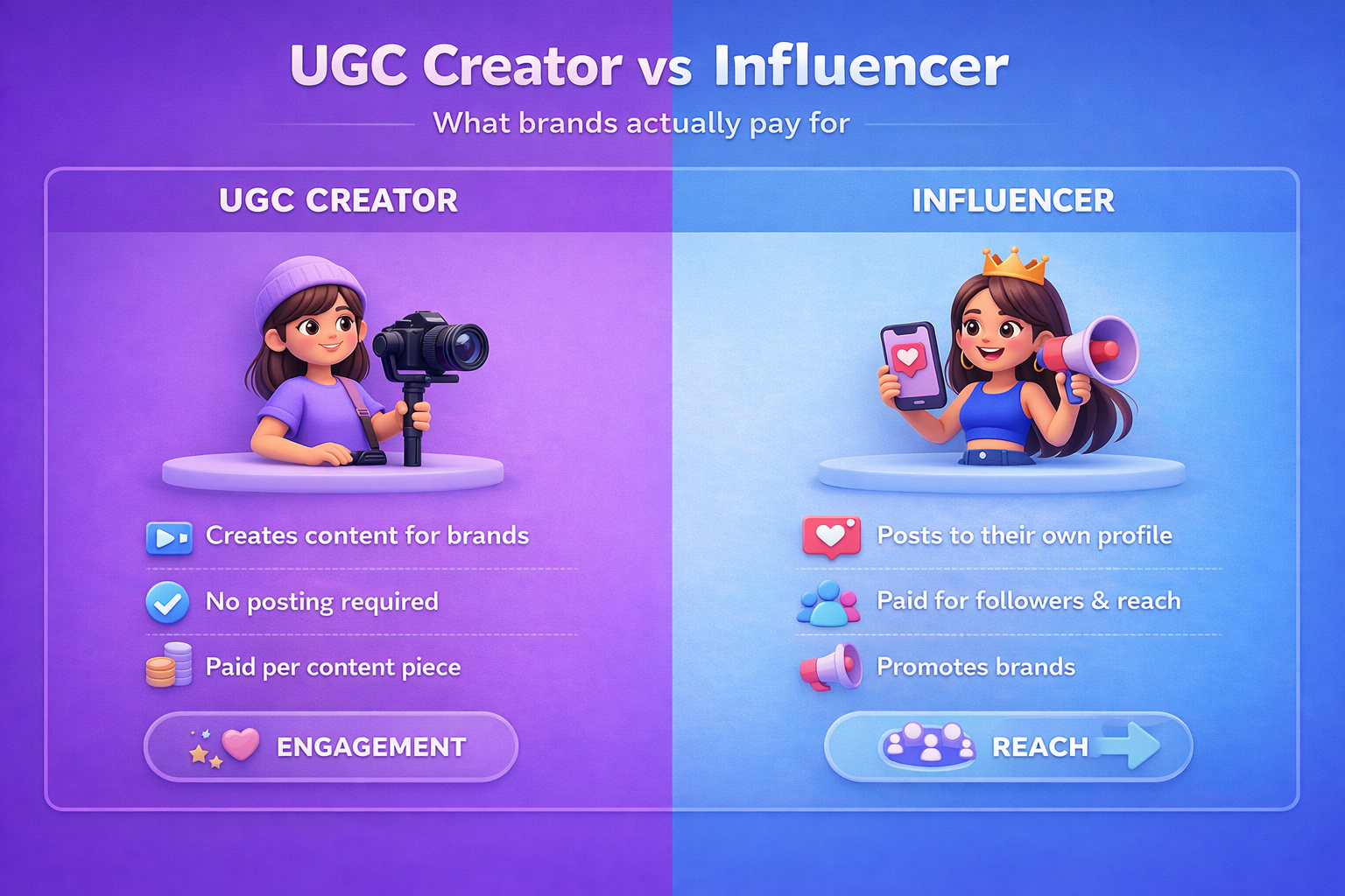 At first glance, UGC creators and influencers may seem similar — they both create content for brands. The difference lies in where the value comes from. Influencers are paid for access to their audience. UGC creators are paid for the content itself. An influencer’s reach and engagement drive the partnership, while a UGC creator’s skill behind the camera is what matters most.